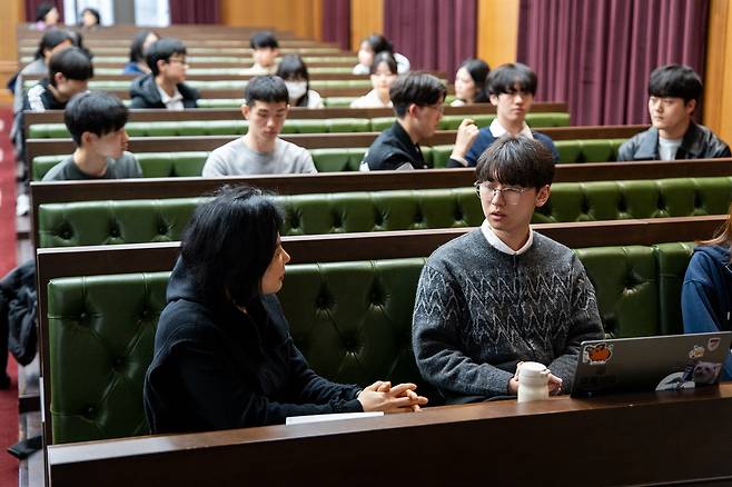 | ▲ 13일 서울 성북구 고려대학교 대강당 아주홀에서는 구수환 (사)이태석재단 이사장의 '종군기자와 이태석신부: 전쟁을 넘어, 인간을 보다!' 강연이 열렸다. 학생들이 '임팩트 랩' 시간에 토의를 하는 모습. |
