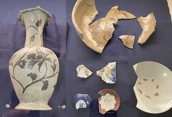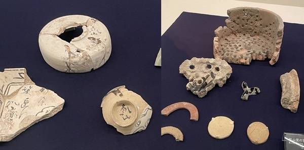 이번 전시에 소개된 고고 유물은 도자기나 도자기 조각, 기와 조각들이 많습니다. 나무나 뼈 들과 같은 유기물은 땅 속에서 사라져 없어지기 때문 남아 있지 않습니다. 도자기 유물들은 일본에서 만들어진 것도 있지만 중국이나 한반도에서 만들어진 것도 있었습니다.