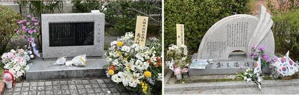 | ▲ 도시샤대학 교정에 있는 윤동주 시비(사진 왼쪽)와 정지용 시비(사진 오른쪽)입니다. 따로 따로 우원식 국회의장과 이영채 오사카총영사 이름이 새겨진 꽃이 놓여있었습니다 |