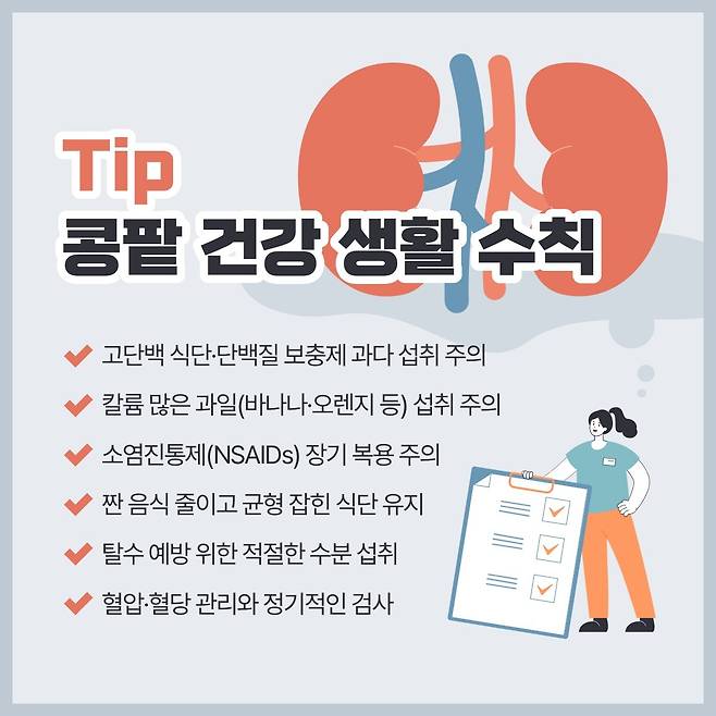 콩팥은 기능이 4분의 1이하로 떨어져서야 자각 증상이 생기므로 정기적인 검진을 받아야 한다.