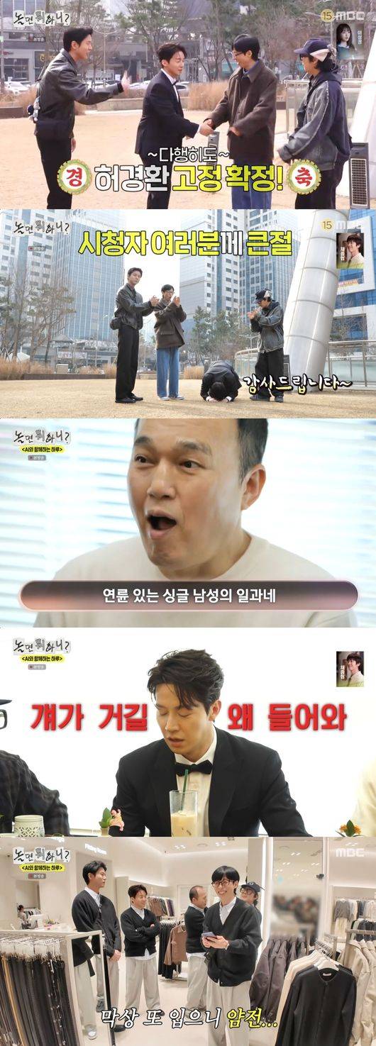 드디어 ‘놀면 뭐하니?’의 고정 멤버가 된 허경환은 턱시도를 입고 등장했다. 허경환은 “긴 시간이었다. 3개월 긴 시간이었다”고 소감을 밝히며 “오늘 좋은 날이다. 너무 감사드린다”고 시청자들에게 큰 절을 했다.