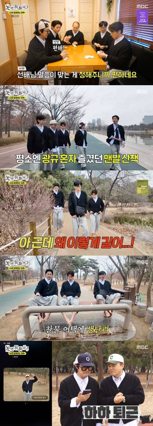 이어 멤버들은 AI가 추천해준 한식당에 가서 점심 식사를 했고, 다음으로는 AI가 단체복 입고 산책을 추천해 공원으로 향했다. 김광규는 자신이 자주 가는 맨발 산책 코스가 있다고 소개했고, 멤버들은 생각보다 추운 날씨에 맨발 산책에 난색을 표했다.