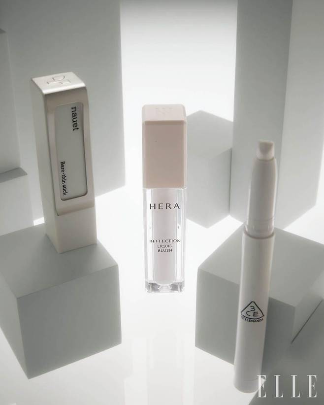 (왼쪽부터) 20%의 수분을 함유한 립 틴트로 텍스처가 물안개처럼 가볍게 스며 투명하게 발색된다. 베어씬 스틱, 05 애릿, 2만6천원, Nauet. 수분 세럼처럼 촉촉하게 발리는 리퀴드 하이라이터. 밀키한 톤의 베이스 위로 핑크 펄이 잔잔하게 반사되며 자연스러운 윤광을 입혀준다. 리플렉션 리퀴드 블러쉬, 밀키피즈, 4만7천원, Hera. 화이트와 실버 펄이 촘촘하게 담겨 영롱하게 빛나는 눈매를 연출하는 아이섀도 스틱. 아이 스위치 스틱, 더블 노트, 1만9천8백원, 3CE.