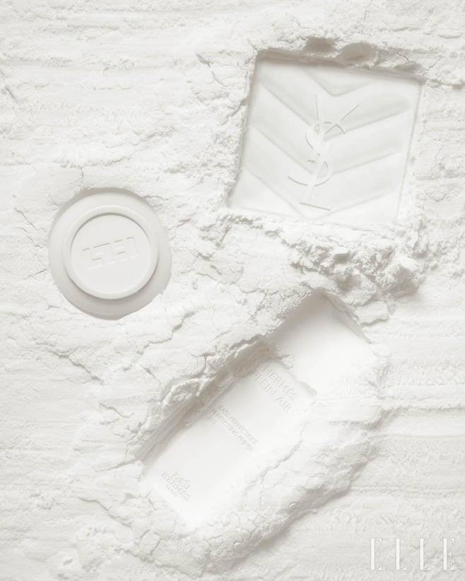 (왼쪽부터 시계 방향으로) 히알루론산이 함유된 세팅 파우더로 텍스처가 곱게 마무리돼 겉은 보송하게 잡아주고 피부 속은 숨 쉬는 듯 편안하다. 소프트 블러 모이스처 락 세팅 파우더, 인비저블, 3만8천원, Simihaze Beauty. ‘바른 거 맞아?’ 싶을 정도로 가벼운 에어-신 펄이 피부 결을 은은하게 밝혀준다. 올아워 하이퍼 루미나이즈, 01, 9만9천원, YSL Beauty. 로션처럼 섬세한 포뮬러가 피부에 가볍게 밀착돼 모공을 메워주고 새틴처럼 보드라운 피부를 연출해 준다. 플랭 에르 하이드레이팅 앤 스무딩 퍼펙팅 프라이머, 15만원, Hermès Beauty.