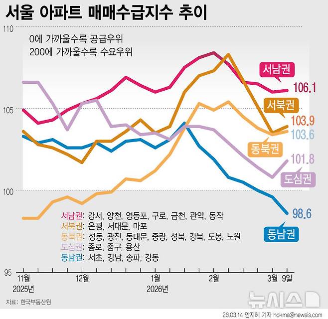 [서울=뉴시스] 14일 한국부동산원 3월 둘째주 주간 아파트가격 동향에 따르면 서울 동남권 아파트 매매수급지수는 98.6으로 나타났다. 지난해 1월 셋째주 98.4를 기록한 이후 57주 만에 가장 낮은 수치다. 동남권을 제외한 권역에서는 ▲도심권(100.8→101.8) ▲동북권(103.4→103.6) ▲서북권(103.5→103.9) ▲서남권(106.0→106.1) 등으로 일제히 매매 수급지수가 상승했다. (그래픽=안지혜 기자)