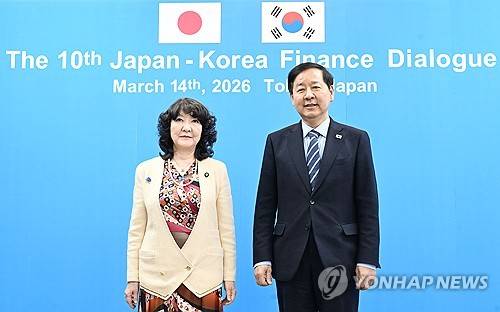한일 재무장관회의(서울=연합뉴스) 구윤철 부총리 겸 재정경제부 장관(오른쪽)과 가타야마 사쓰키 일본 재무상이 14일 일본 도쿄 재무성에서 한일 재무장관 회담에 앞서 기념촬영을 하고 있다.