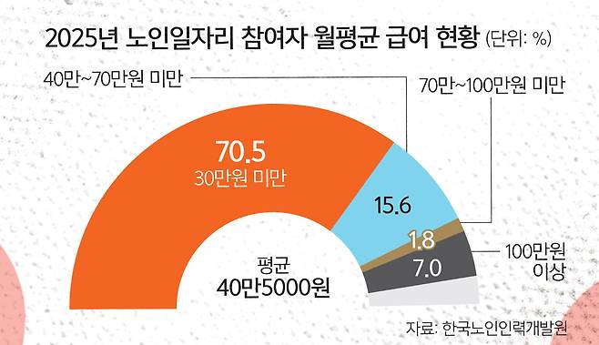 12일 세계일보가 한국노인인력개발원이 지난 1월 발표한 '2025년 노인 일자리 및 사회활동 지원사업 실태조사' 분석 결과에 따르면 조사 참여자(2985명)의 월평균 급여는 40만5000원이었다.