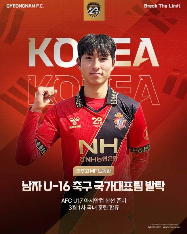 경남FC U18(이하 진주고) 소속 노동완은 남자 U16 대표팀 소집 명단에 이름을 올렸다. 이번 대표팀 소집 훈련은 오는 3월 23일(월)부터 3월 27일(금)까지 강원도 원주시 일원에서 진행되며, 'AFC U17 아시안컵 2027' 본선 준비를 위한 선수 기량 점검을 목적으로 실시된다.