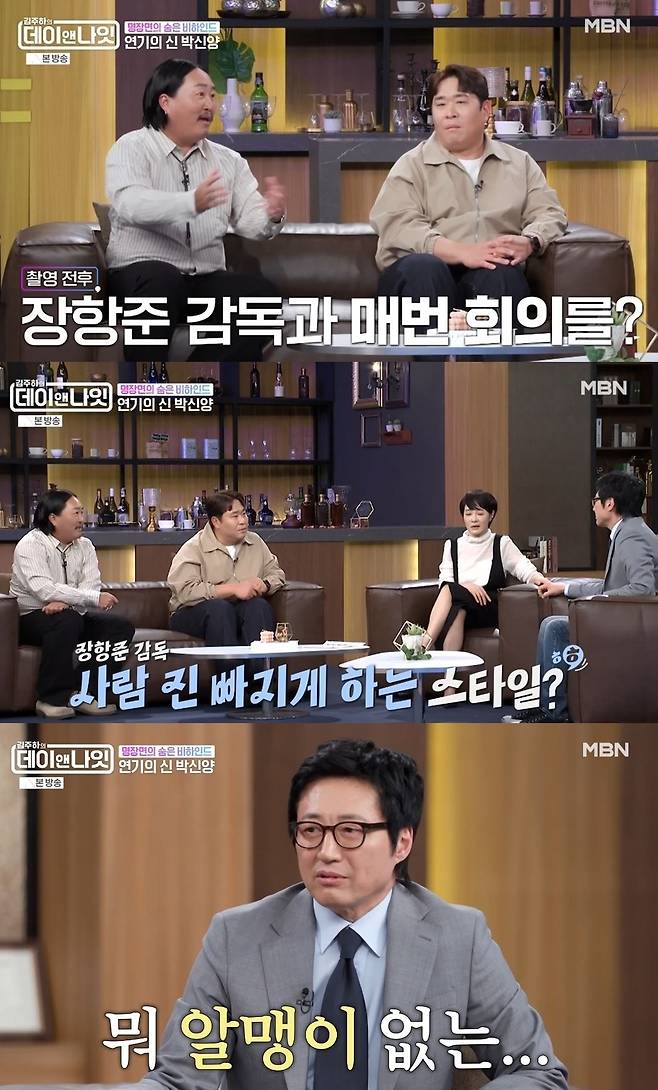 문세윤이 "장항준 감독과 길게 대화를 나눠보지는 못했지만 사람을 진 빠지게 하는 스타일이라고 들었다. 말이 굉장히 많다고 하더라"고 하자, 박신양은 "말이 좀 많긴 했다. 주로 알맹이 없는 대화였다"고 너스레를 떨었다.
