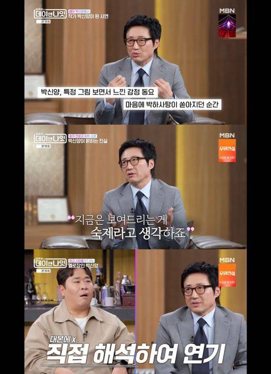 박신양은 지난 14일 오후에 방송된 종합편성채널 MBN 토크쇼 '김주하의 데이앤나잇'에 출연해 배우이자 화가로서의 삶에 대해 밝혔다. 또 그는 딸바보의 면모까지 드러내며 풍성한 웃음과 감동을 선사했다.