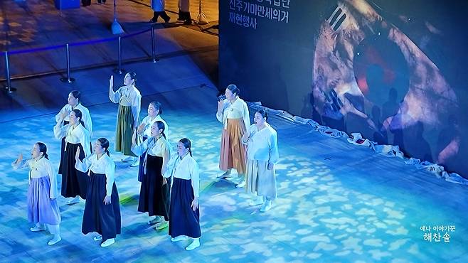 무대 위에서는 기생으로 분한 배우들이 줄을 맞춰 섰습니다. 흰 저고리와 검은 치마, 옅은 자줏빛과 갈빛 치마가 푸른빛 위에서 선연하게 살아났습니다. 뒤편 현수막의 낡은 태극기 이미지와 무대 바닥에 번지는 조명이 서로 겹치자, 장면은 설명보다 먼저 기억으로 다가왔습니다. 객석의 태극기 물결도 그 장면에 힘을 보탰습니다. 몇 사람만 재현극을 만든 것이 아니었습니다. 시민들도 함께 그 장면을 완성했습니다.