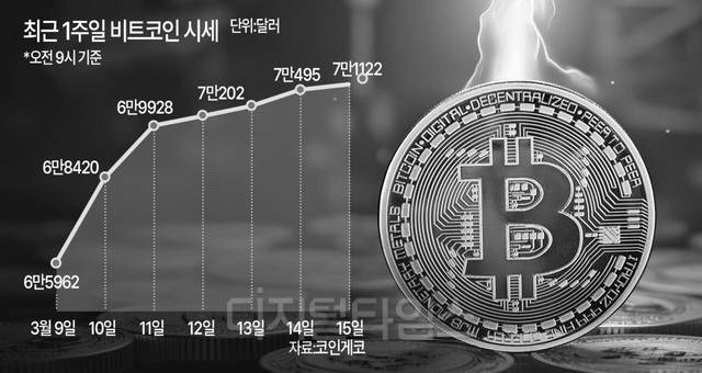 최근 비트코인은 7만달러 안팎에서 거래되며 전쟁 관련 소식에 따라 수천 달러씩 등락을 반복하는 불안정한 흐름을 보이고 있다. 지난 주 주말 사이 호르무즈 해협 봉쇄 우려가 확산되며 비트코인은 6만5000달러선까지 밀렸다.