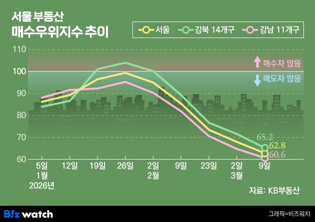 KB부동산이 발표한 '2026년 3월 2주 전국아파트시장동향(9일 기준)'에 따르면 서울 매수우위지수는 62.8로 지난주보다 5.1포인트 내렸습니다.
