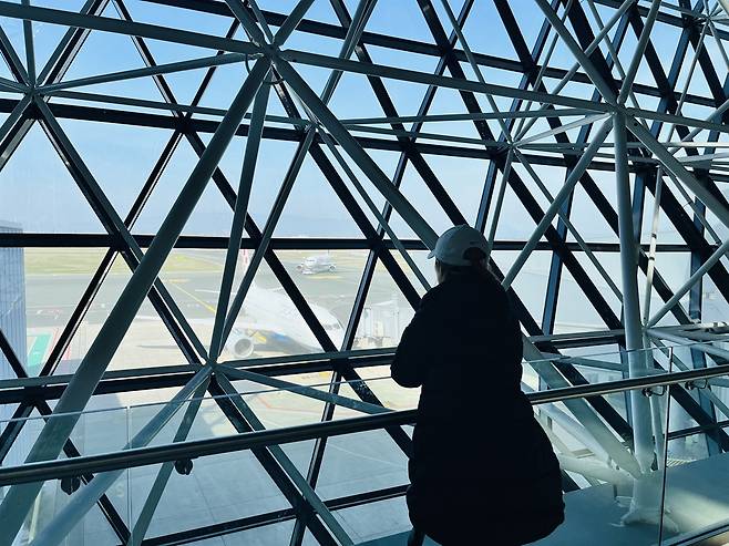 | ▲ 창가 너머 비행기에 담긴 지난 8개월의 여정. 이제 곧 우리를 한국으로 데려다줄 비행기를 바라보는 아내. 8개월 전, 설레는 마음으로 올랐던 비행기보다 지금 이 순간의 창밖 풍경이 더 깊고 아련하게 느껴진다. |