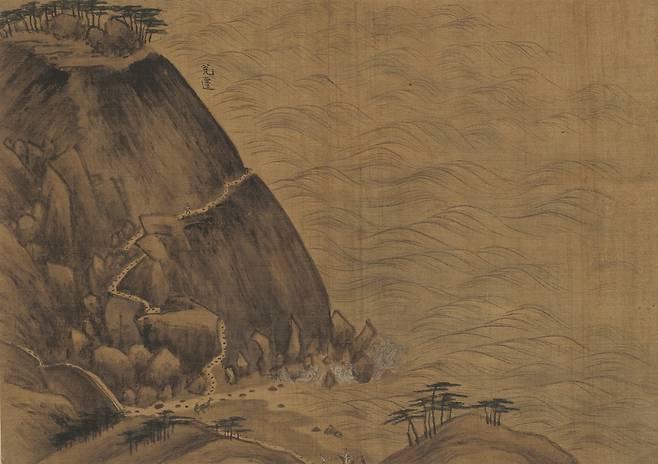 그런데 그 숨 막히는 대자연의 위용 속, 절벽을 따라 난 위태로운 길 모퉁이에 아주 작은 틈이 있습니다. 벼랑을 돌아 막 시야에서 사라지려는 나귀의 삐죽 튀어나온 뒷다리와 꼬리 하나. 그 작은 디테일 하나가 그림의 공기를 완전히 바꿔놓습니다. 거대하고 준엄한 자연의 풍경이, 그 속을 부대끼며 살아가는 팍팍한 인간의 삶을 지나 입가에 슬며시 미소를 번지게 하는 따뜻한 해학으로 치환되는 순간이죠.