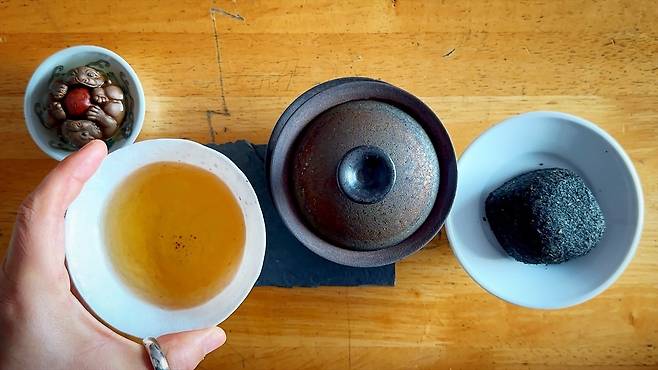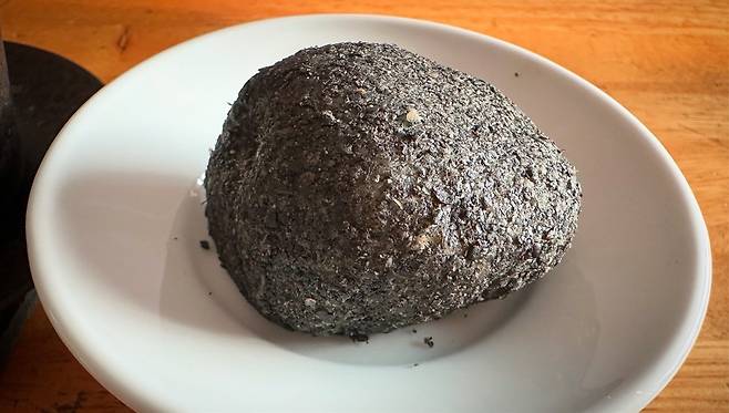 | ▲ 그림에서 착안해서 찰떡궁합을 기대했는데, 동방미인에 곁들이니 흑임자의 향기가 강렬하게 훅 올라와서 호불호가 있을 것 같은 맛이었다. 하지만 그 첫 관문을 지나면 부드럽게 올라오는 쑥향과 찰떡의 쫄깃함, 팥소의 달콤함과 동방미인이 제법 잘 어우러져 맛있었다. |