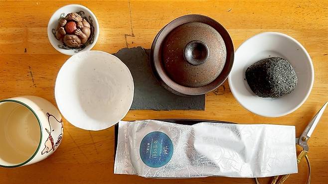 | ▲ 정선의 그림에서 발견한 디테일과 닮은점이 많은 동방미인과, 박연폭포에 등장한 바위를 닮은 흑임자오메기떡을 찻자리에 모아봤다. |