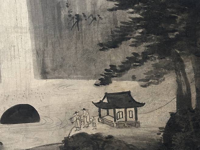 | ▲ 왼쪽에 보이는 검고 둥근 바위가 마치 흑임자 오메기떡과 같아 곁들이면 찰떡이라 생각하며 그림속 선비들은 무슨 말을 주고받았을지 궁금해졌다. 손을 들고 상대방을 바라보는 선비는 분명 가이드일 것이고, 시동이 따라온 선비는 손님일 것 같은데..... |