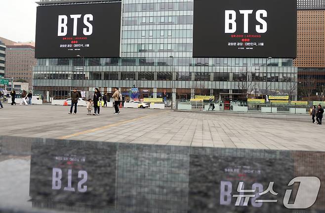 (서울=뉴스1) 김명섭 기자 = 15일 서울 종로구 kt빌딩 전광판에 방탄소년단(BTS)의 컴백 라이브 공연 광고가 나오고 있다. 약 3년 9개월 만에 컴백하는 방탄소년단(BTS)의 공연은 오는 21일 오후 8시 광화문광장에서 ‘BTS 컴백 라이브: 아리랑(ARIRANG)’이라는 타이틀로 개최된다. 2026.3.15/뉴스1