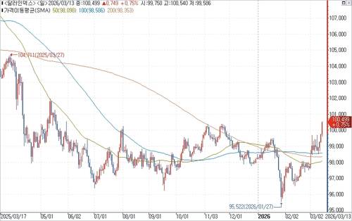 지난주 달러인덱스는 마지막 거래일까지 나흘 연속 오름세를 보였다. 주간 종가 기준으로 100선을 웃돈 것은 작년 11월 하순 이후 처음이다.