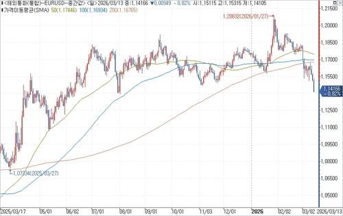 유로-달러 환율은 1.14166달러로 전주대비 1.63% 하락(유로 대비 달러 강세)했다. 작년 6월 초순 이후 최저치다.