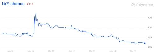 예측사이트 폴리마켓에 따르면, 미국과 이란이 이달 말까지 휴전할 가능성은 10% 중반대에 불과한 것으로 나타났다. 전쟁이 장기화한다면 에너지발 물가 상승 압력을 '일시적' 요인으로 치부하고 넘어가기는 어려워질 수 있다.