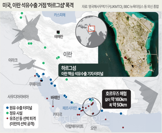 미국이 하르그섬을 폭격하자 이란은 곧바로 보복에 나섰다. 중동 현지 매체와 로이터에 따르면 이란은 호르무즈 해협을 우회하는 원유 수출 거점인 아랍에미리트(UAE) 푸자이라 항구를 드론으로 공격했다.
