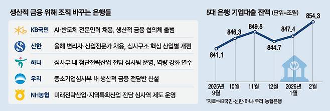정부의 생산적 금융 기조가 계속 강화되면서 각 은행들이 외부 전문인력 채용을 늘리고, 기업여신 부문의 조직 개편도 단행하고 있다.