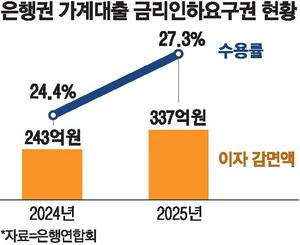 은행권의 수용 태도도 전향적으로 변했다. 지난해 금리인하요구 수용 건수는 38만2158건으로 전년보다 30% 늘었다. 이에 따라 2024년 24.4%였던 수용률은 지난해 27.3%로 3%포인트 가까이 반등했다. 감면폭도 커졌다. 지난해 은행권의 가계대출 이자감면액은 약 337억원을 기록해 전년(243억원) 대비 39%나 늘었다. 은행권 평균 금리 인하폭도 0.46%포인트로 전년 대비 0.06%포인트 올랐다.