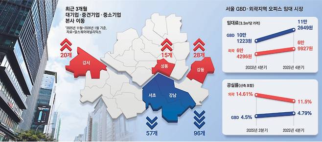반면 GBD 오피스의 공실률은 2023년 4분기 2.07%에서 지난해 4분기 4.79%로 꾸준히 오른 것으로 나타났다. 최근 석 달간 강서구로 가장 많이 이전한 지역도 강남(23개)이었다. 류강민 알스퀘어 리서치센터장은 “경기가 둔화되는 상황에서 임대료가 저렴한 곳으로 가려는 것”이라며 “마곡 등 서울 외곽은 입지가 다른 권역에 비해 떨어지긴 하지만 그런 부분도 고려해 이전하는 것”이라고 설명했다.