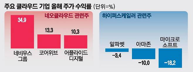 인공지능(AI) 인프라 대장주로 꼽히던 3대 하이퍼스케일러(구글(알파벳)·아마존·마이크로소프트)와 비교해 네오클라우드 관련주가 올해 들어 더 높은 수익률을 기록하고 있다.