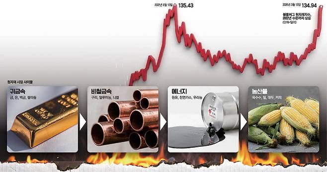 최근 원자재 가격 상승세가 2022년 상황을 연상시키고 있다. 당시 러시아·우크라이나 전쟁 발발로 물가가 급등하자 주식·채권 포트폴리오가 100년 만에 최악의 성과를 냈다. 반면 원자재는 홀로 오름세를 보이면서 인플레이션 방어 자산으로 주목받았다.