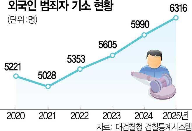 15일 대검찰청 검찰통계시스템에 따르면 지난해 재판에 넘겨진 외국인 피의자는 6316명으로 2024년(5990명)보다 5.4% 증가했다. 기소되는 외국인 피의자는 지난 2016년만 해도 3985명에 불과했다. 하지만 2018년(4162명) 처음으로 4000명선을 넘어섰다. 이후 해마다 증가하면서 2년 만인 2020년 5221명을 기록, 5000명선을 돌파했으며 지난해에는 10년 내 최고치를 기록했다.