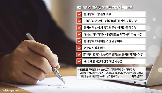 안정혜 변호사는 “국제물품매매에 관한 유엔 협약(CISG) 가입국이라면 이 조약이 민법·상법 등 국내법에 앞서 적용되는데, 이 지점을 놓치기 쉽다”고 조언했다. CISG는 불가항력을 명시하진 않지만 79조에 그에 준하는 규정을 두고 있다.