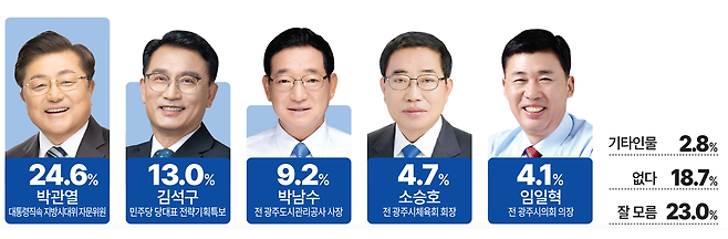 김석구 더불어민주당 당대표 특별보좌역 전략기획특보는 13.0%, 박남수 전 광주도시공사 사장 9.2%, 소승호 전 광주시체육회장 4.7%, 임일혁 전 광주시의회 의장 4.1%로 조사됐다.