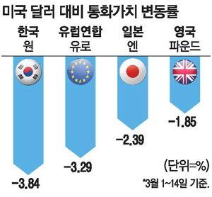 같은 기간 주요 6개국 통화 대비 달러가치를 나타내는 미국 달러 인덱스가 2.92% 상승한 것과 비교하면 달러 강세 폭보다 원화값이 더 큰 수준으로 하락한 것이다.