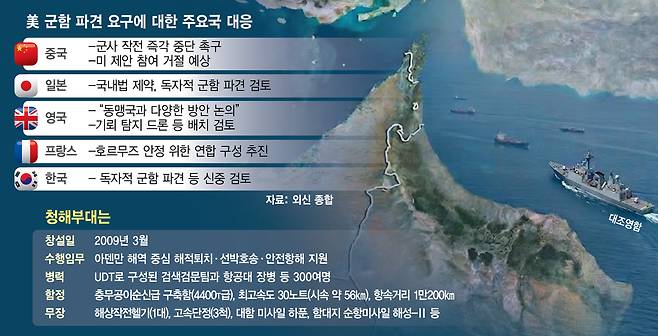 하지만 군함 파견은 전쟁 참전 논란을 불러올 수 있고 이란과의 관계도 고려해야 하는 만큼 정부로서는 쉽게 결정을 내리기 어려운 상황이다.