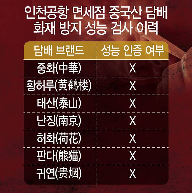 실제 취재진은 중국산 담배 유통 경로를 추적하기 위해 지난달 두 차례에 걸쳐 인천국제공항 면세점을 방문했으며 화재 방지 성능을 인증받지 않은 해당 제품들이 현장에서 판매 중인 사실을 확인했다.