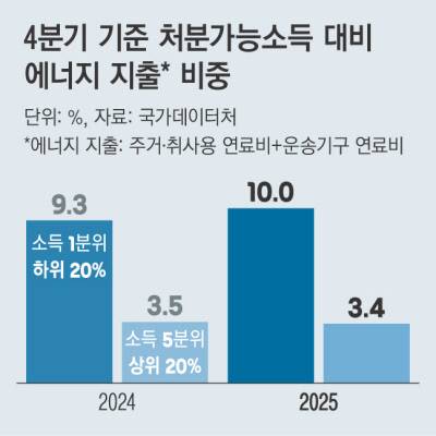 하위 20% 가구의 에너지 지출 비중은 4분기 기준 2021년 9.9%에서 러시아·우크라이나 전쟁이 발발한 2022년 10.9%로 올랐다. 이후 2023년 10.2%, 2024년 9.3%로 하락했다가 지난해 다시 늘었다.