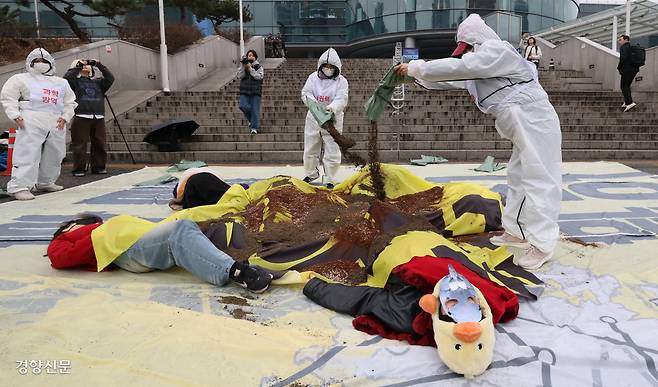 살처분폐지연대 활동가들이 15일 서울역 광장에서 살처분 폐지를 촉구하는 퍼포먼스를 하고 있다. 이들은 조류인플루엔자(AI) 예방을 이유로 지난겨울에만 산란계 1000만마리가 살처분된 것을 비판하기 위해 이 행사를 마련했다.