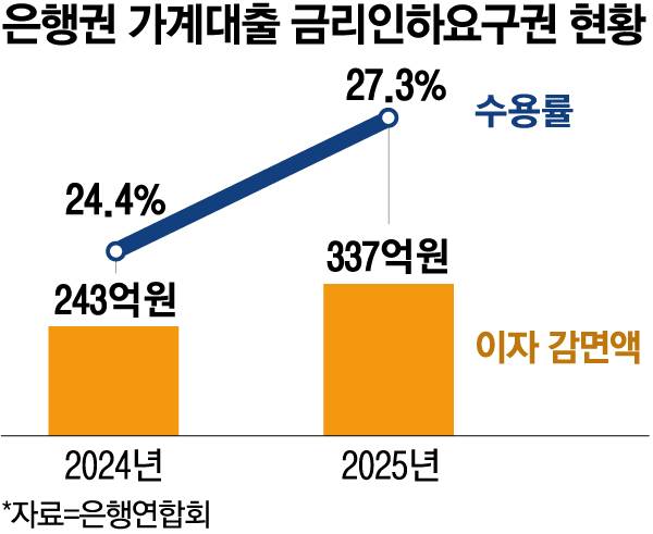 은행권의 수용 태도도 전향적으로 변했다. 지난해 금리인하 요구 수용건수는 38만2158건으로 전년보다 30% 늘었다. 이에 따라 2024년 24.4%였던 수용률은 지난해 27.3%로 3%포인트 가까이 반등했다.