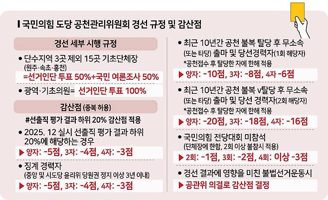 이와 관련, 현역 선출직은 '선출직 평가 결과' 하위 20%에 해당할 경우, 양자 경선시 -5점, 3자 경선시 -4점, 4자 경선시 -3점의 감산점이 적용된다.