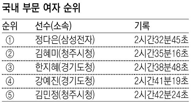 이날 정다은은 2시간32분45초의 기록으로 가장 먼저 골인했다. 레이스 중반부터 일찌감치 독주 체제를 갖춘 정다은은 2위 김혜미(32·청주시청·2시간35분16초)를 2분31초 차로 따돌리며 압도적 우승을 차지했다. 그런데도 정다은은 “목표로 했던 2시간20분대 기록에 미치지 못해 아쉬움이 남는다”고 했다.