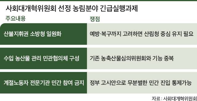 산불 대응체계의 손질과 수입 농산물 관리 민관협의체 신설 등이 우선 해결해야 할 사회개혁 과제로 꼽혀 주목받는다.