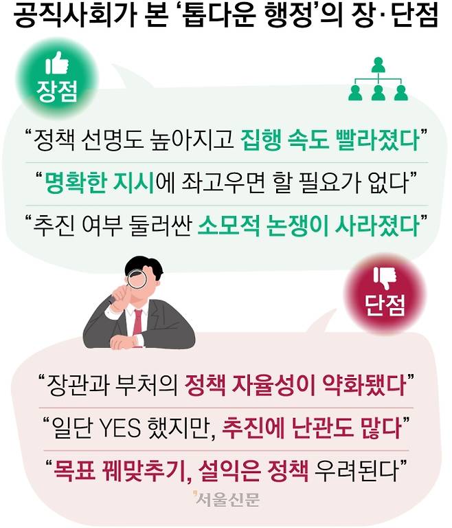 하지만 ‘정책의 속도감’ 측면에서 긍정적인 평가도 나온다. 정책이 현실화하는 속도가 빨라지면 결국 정책 수용자인 국민이 혜택을 본다는 점에서다. 한 경제부처 과장급 공무원은 “과거 1년은 걸리던 정책 검토가 단 몇 주만에 이뤄진다”면서 “정책 추진과 입법, 시행까지 긴 시간이 필요하지 않게 되면서 정책 체감도가 한층 높아진 것 같다”고 말했다. 한 사회부처 과장급 공무원은 “대통령이 구체적이고 명확하게 지시를 내리면서 정책을 추진할지 말지 좌고우면할 필요가 없어졌다”면서 “지금은 정해진 방향대로 밀고 나가면 되는 분위기”라고 전했다.