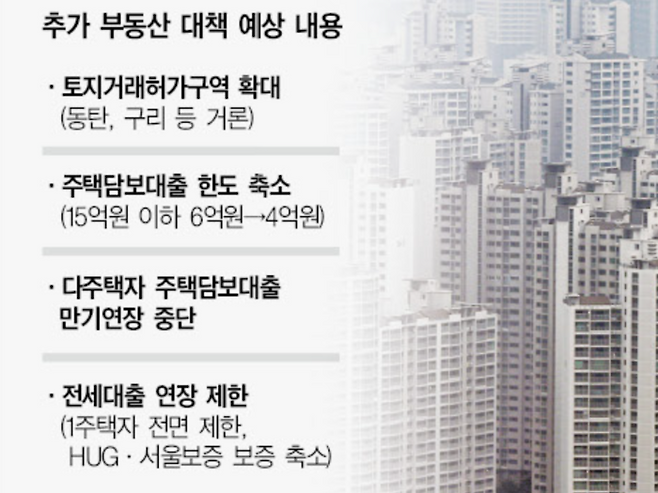 업계에서는 주택담보대출 한도를 15억 이하의 경우 기존 6억원에서 4억원으로 낮추는 등 추가적인 제한조치도 거론되고 있다. 전세대출의 경우도 1주택자에 대해서는 전세대출을 전면 제한하고, HUG나 서울보증 등의 보증도 줄이는 방안도 제시될 카드로 꼽고 있다. 다주택자가 보유한 수도권 아파트의 경우 대출만기가 도래할 경우 만기연장을 제한하는 방안도 유력하다.
