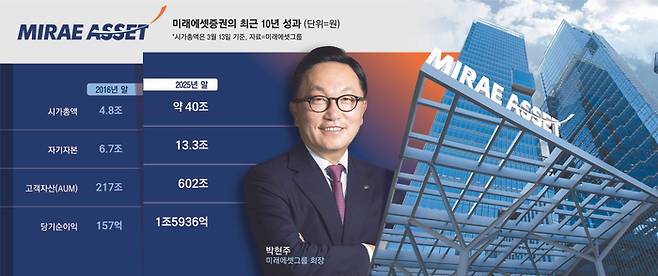 2016년 미래에셋증권은 대우증권과 합병해 해외법인을 기존 4곳에서 10곳 이상으로 대폭 확장했다. 당시 대우증권은 대주주인 산업은행의 글로벌 네트워크를 따라 이미 홍콩·영국·일본·인도네시아·몽골 등에 투자은행(IB) 비즈니스를 중심으로 해외법인을 구축하고 있었다. 대우증권 인수가 미래에셋의 해외 진출 전략에 날개를 달아줬다. 이후 10년이 지난 지금까지도 미래에셋의 시선은 국내가 아닌 해외를 향하고 있다. 지난 1월 말 박현주 미래에셋그룹 회장은 임직원들에게 보낸 신년사를 통해 그룹의 다음 10년을 이끌 핵심 전략으로 ‘글로벌 투자 네트워크 확대’ ‘글로벌 영토 확장’을 꼽으며 다시 한 번 전 세계 시장을 정조준했다.