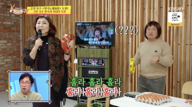 먼저 이순신은 날계란을 먹으며 목소리 관리에 나섰고, 장 이사는 “두개만 더 드시면 되겠다”고 했다. 이순실이 갑자기 날달걀을 먹는 이유는 바로 ‘전국노래자랑’ 출연을 위해서라고.