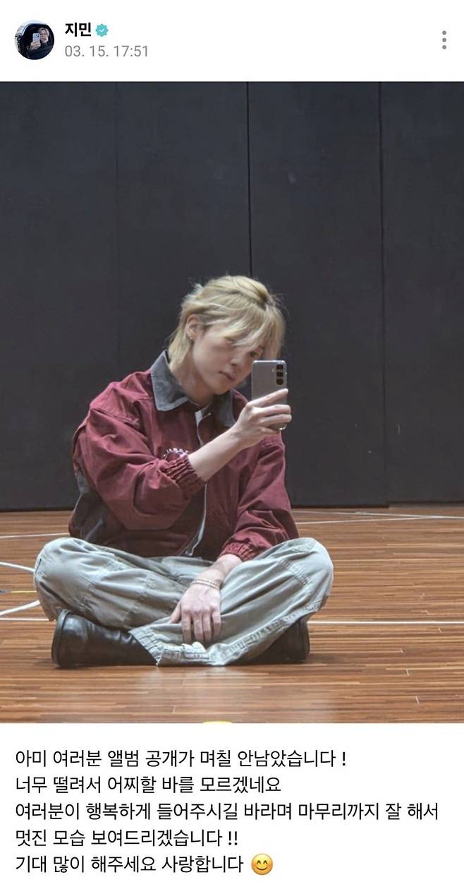 지민은 “아미 여러분 앨범 공개가 며칠 안 남았습니다! 너무 떨려서 어찌할 바를 모르겠네요. 여러분이 행복하게 들어주시길 바라며 마무리까지 잘 해서 멋진 모습 보여드리겠습니다. 기대 많이 해주세요 사랑합니다”라고 전했다.