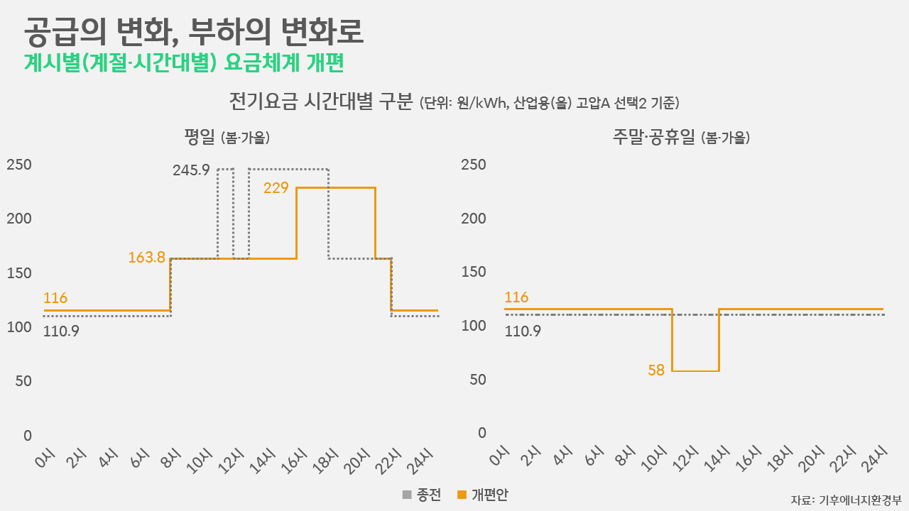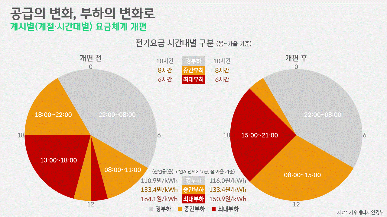 이번 개편안에선 이 시간대별 구분이 좀 더 단순해졌습니다. 봄~가을 기준, 경부하 시간대는 종전과 마찬가지로 밤 10시부터 오전 8시 사이입니다. 그리고 통상 '일과시간'의 절반인 오전 8시부터 오후 3시 사이엔 중간부하, 이후 오후 3시부터 밤 9시 사이는 최대부하, 이후 경부하 시간대가 찾아오기 전까지인 밤 9시~10시 사이엔 중간부하로 구분됐죠. 겨울철 부하 구분은 달라지지 않았습니다.